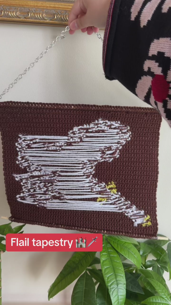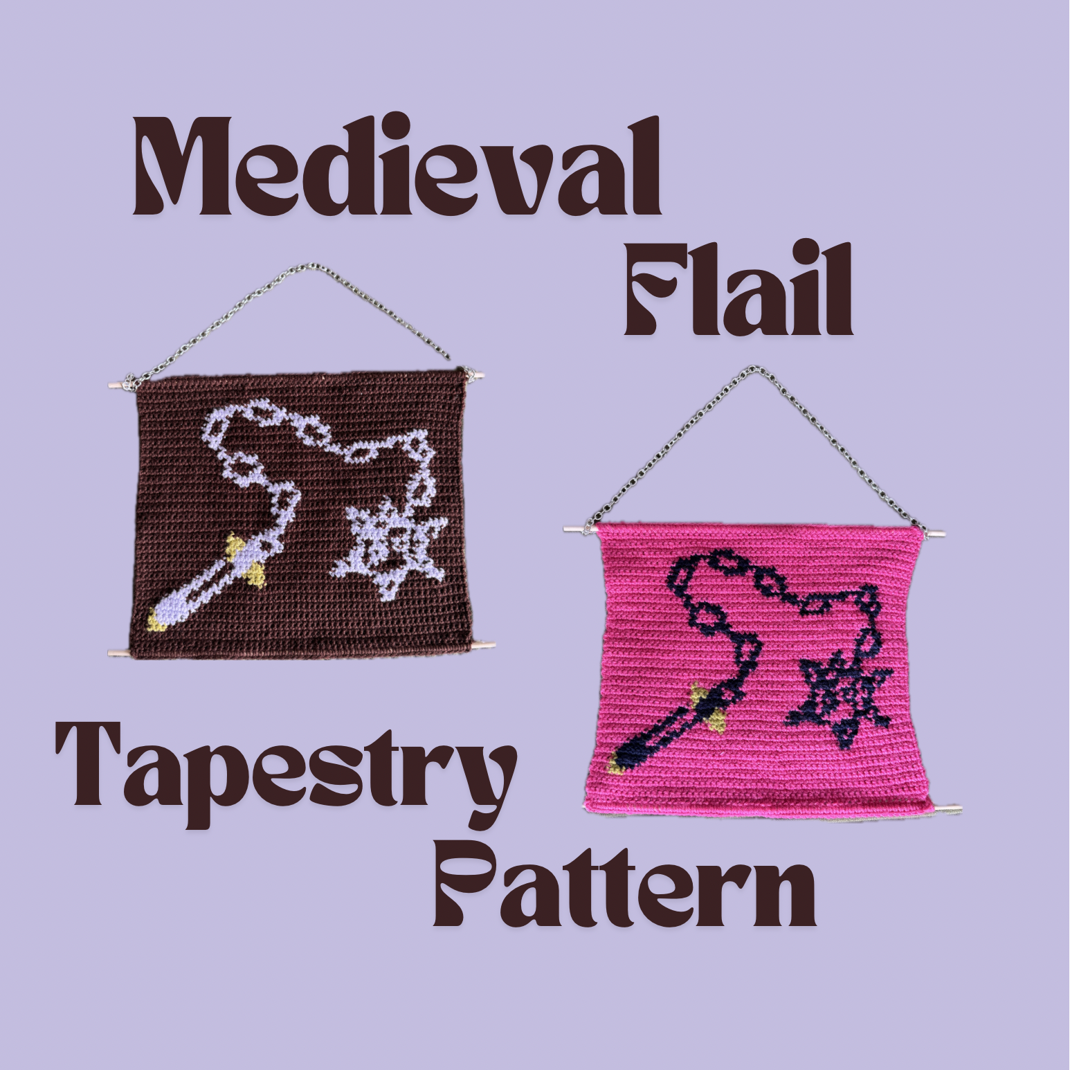 Crochet Tapestry Digital Pattern - Medieval Flail Design. Comes with a link to a stitch fiddle grid as well as instructions to attach the tapestry to a dowel for easy hanging.